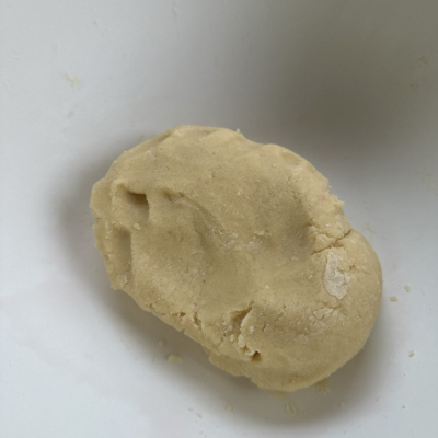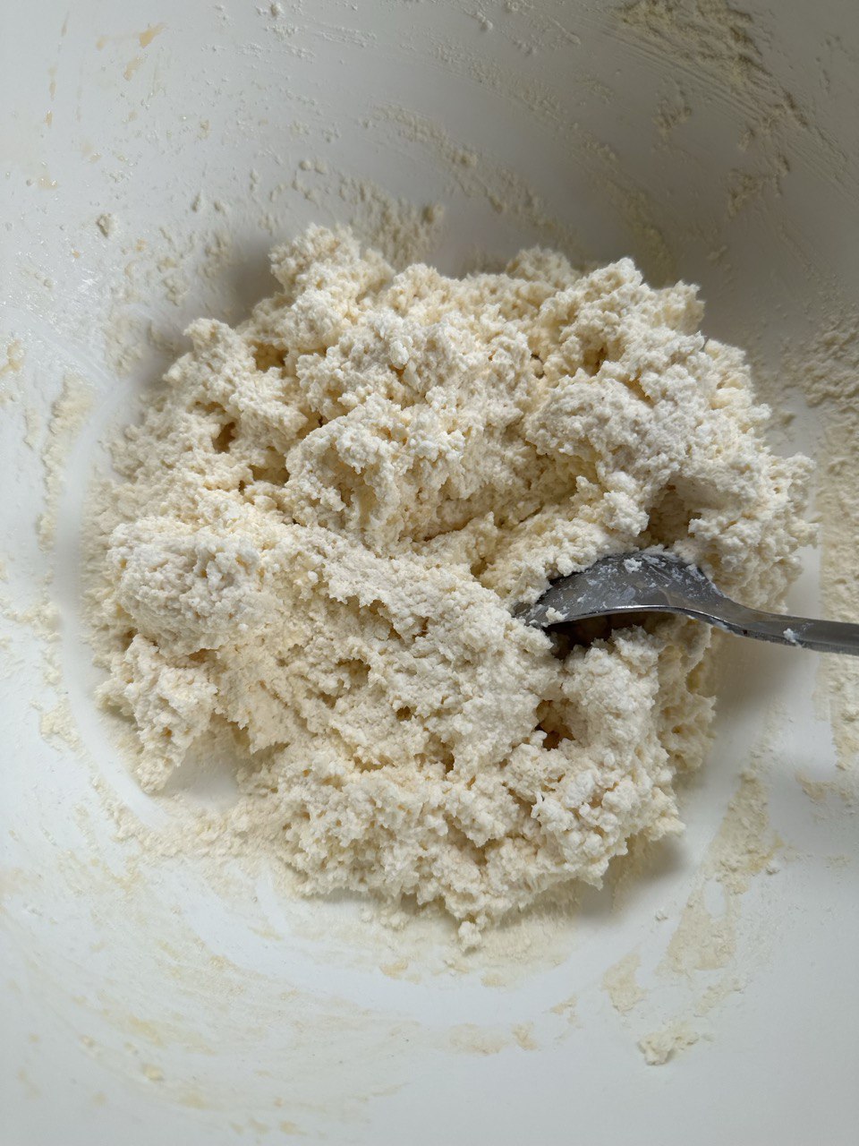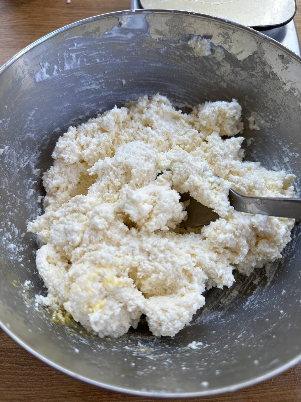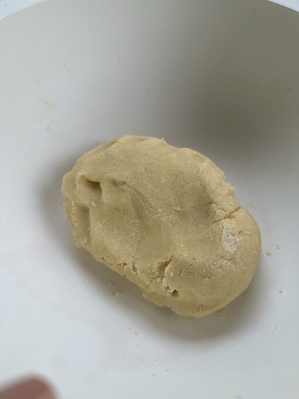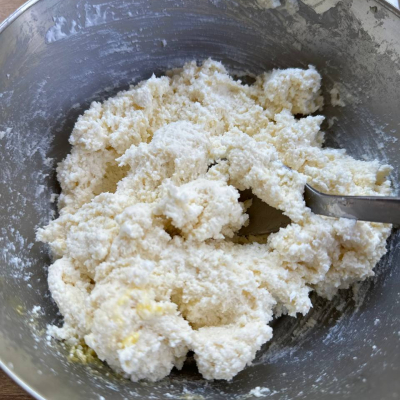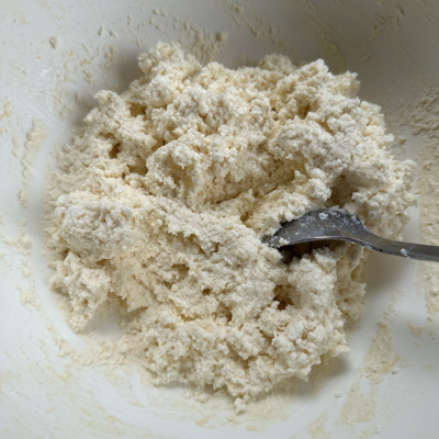 Месим руками пока тесто не собирётся в колобок. Оправляем в холодильник.