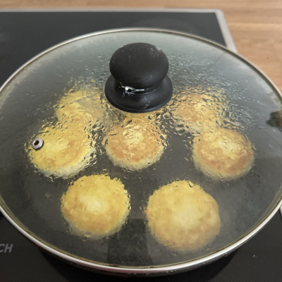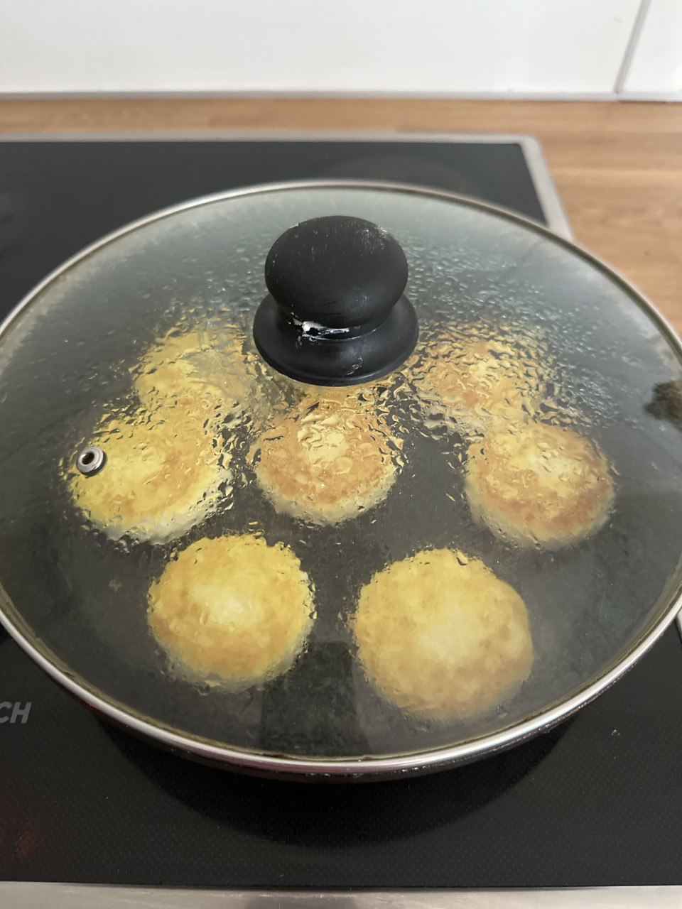 Выложить на разогретую сковородку и жарить на среднем и ниже среднего!!! без крышки до румяного цвета, перевернуть и еще пару минут под крышкой до золотистого цвета (готовности).