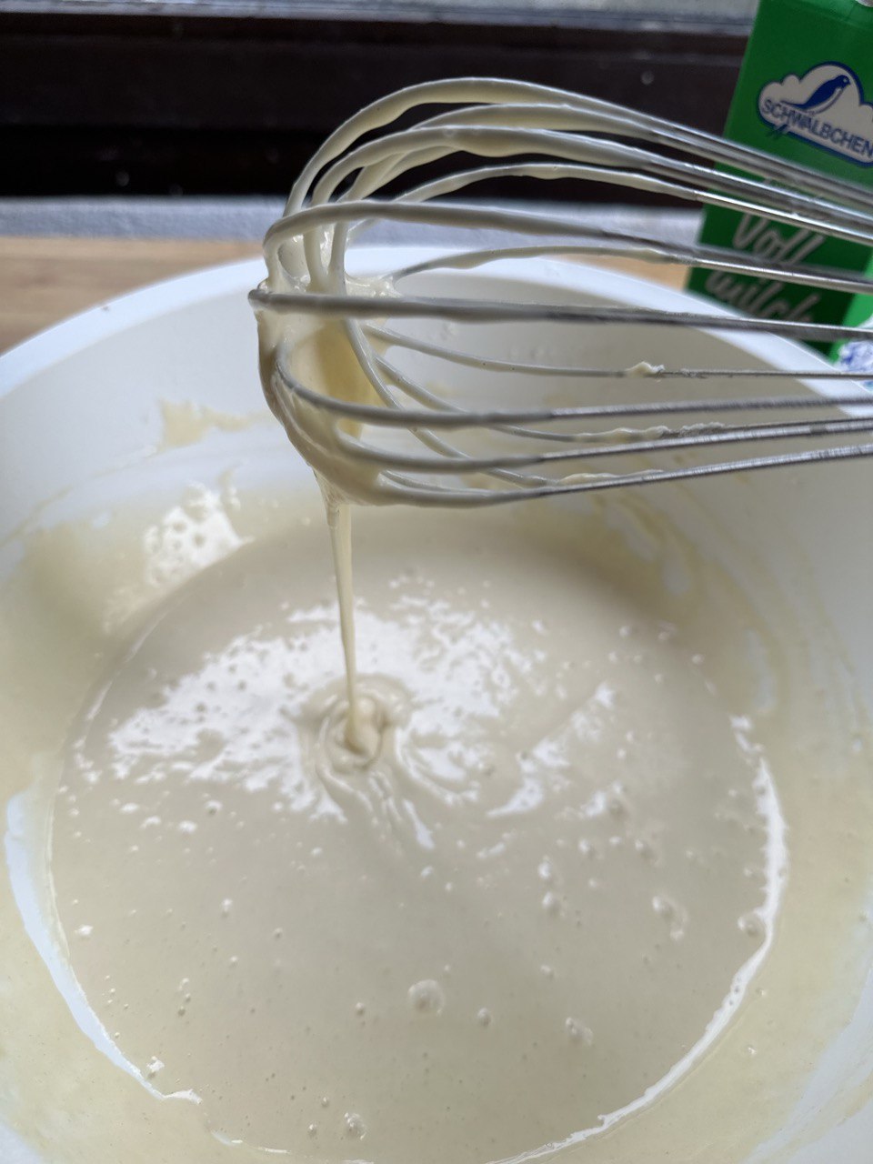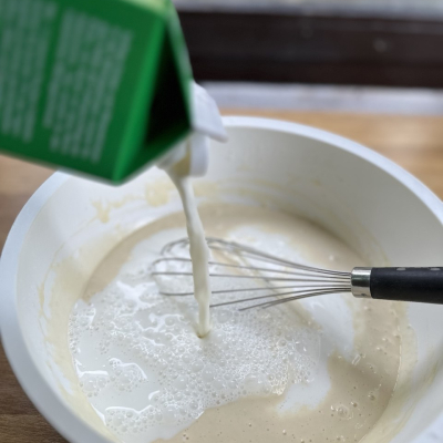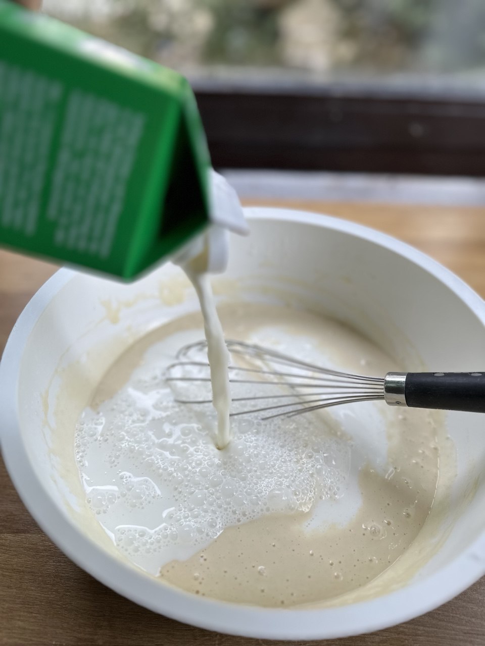 Затем влить оставшуюся часть молока. Эту часть не пропускайте, иначе тесто будет с комками.