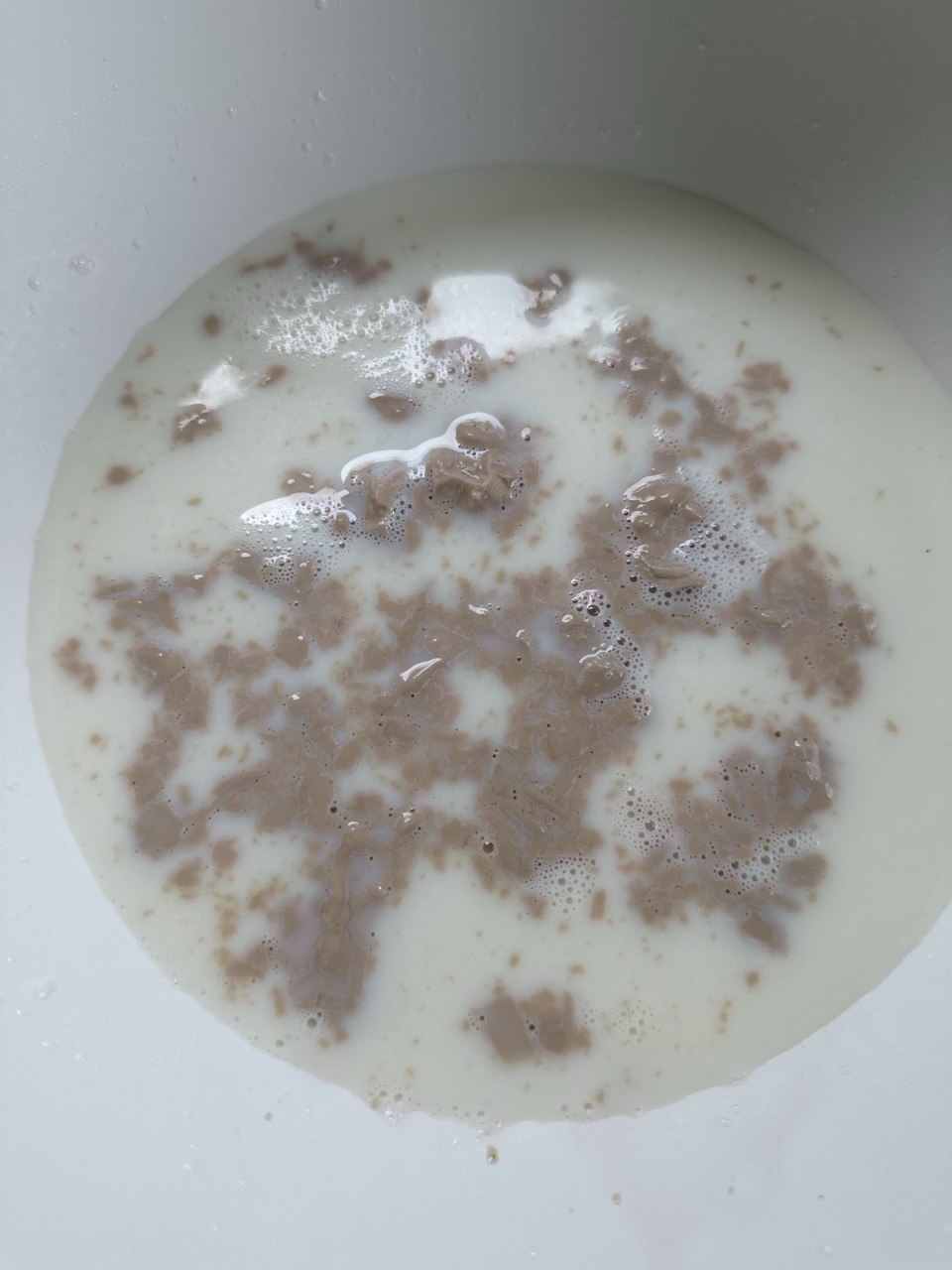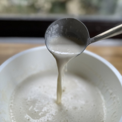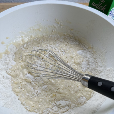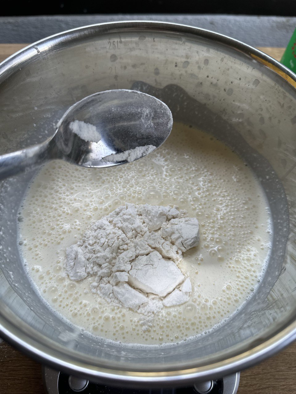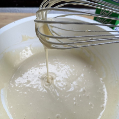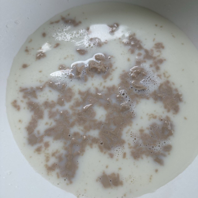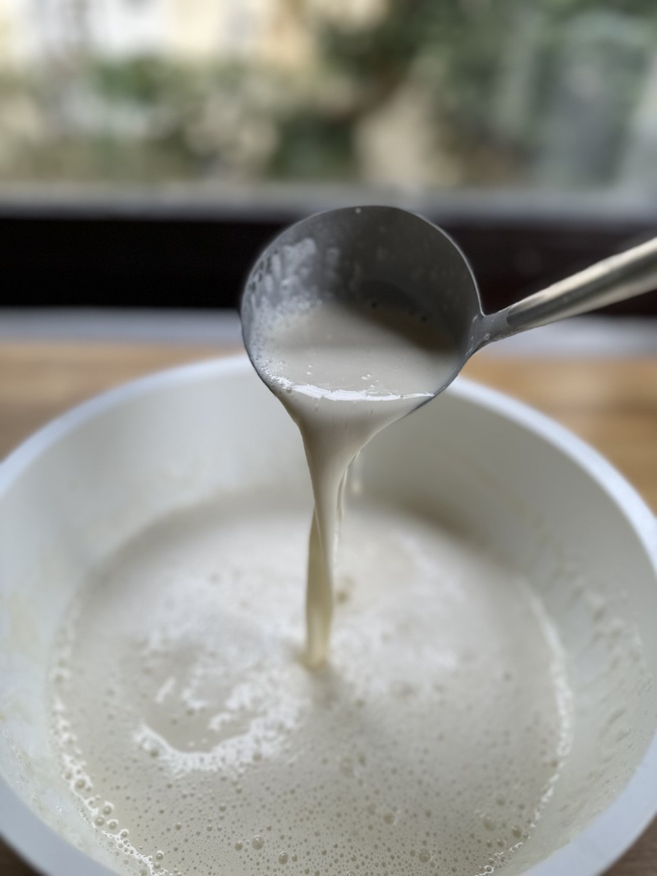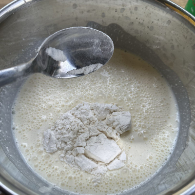 Молоко разделить на две порции. Все ингредиенты смешать последовательно - получается густое тесто как сметана.