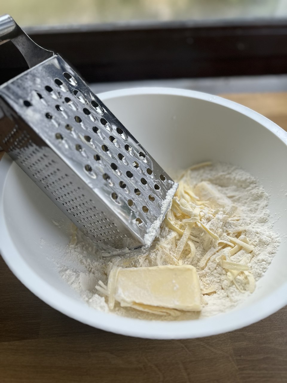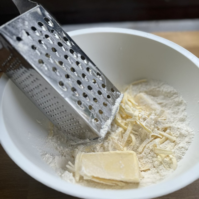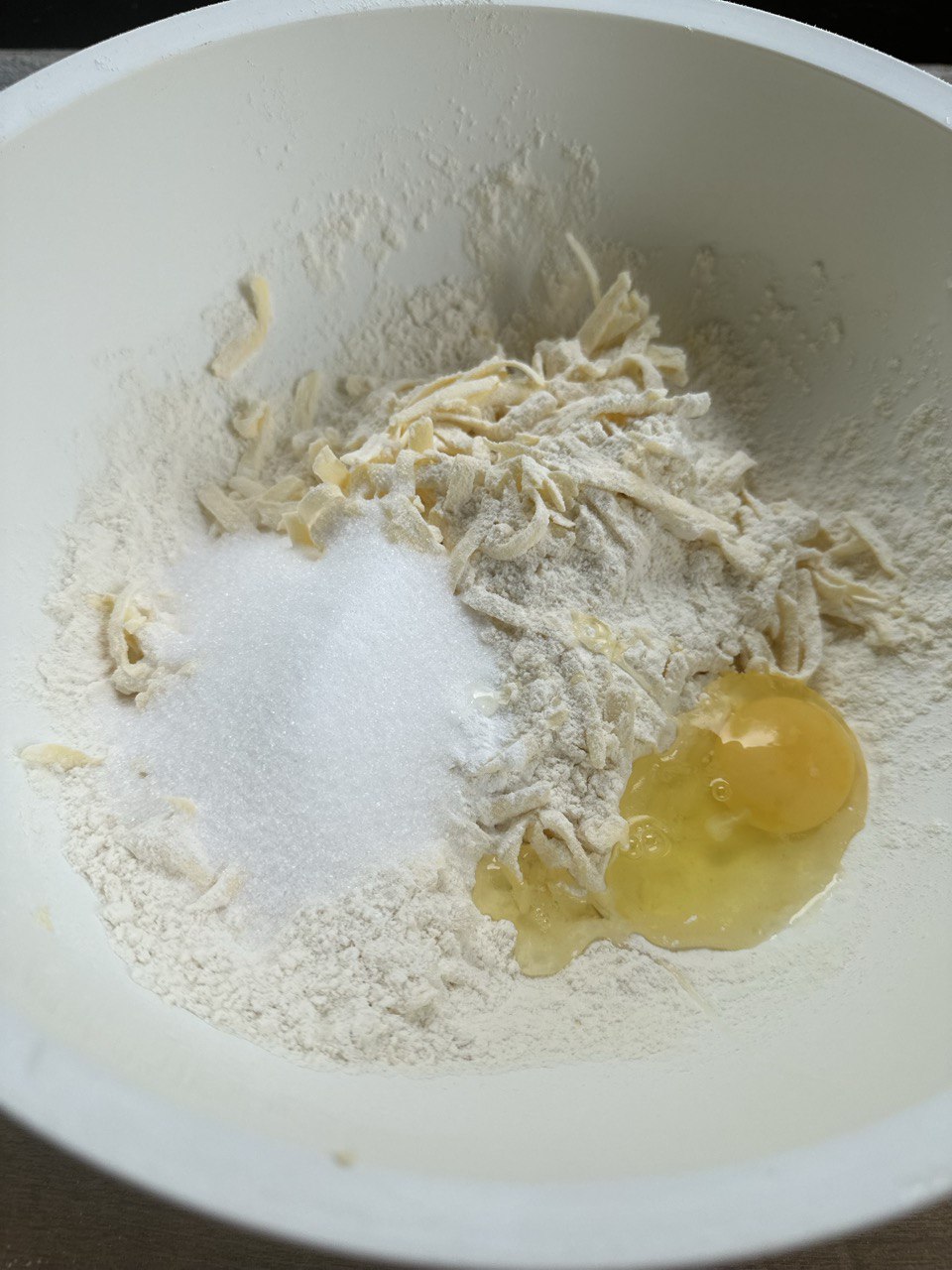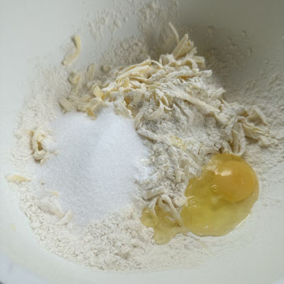 Сливочное масло обмакнуть в муку и натереть на терке. К мучной маслянистой смеси добавить яйцо, сахар, соль