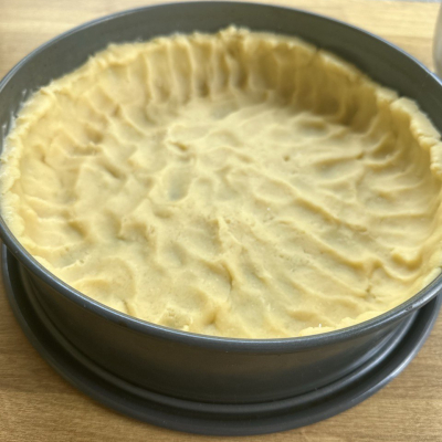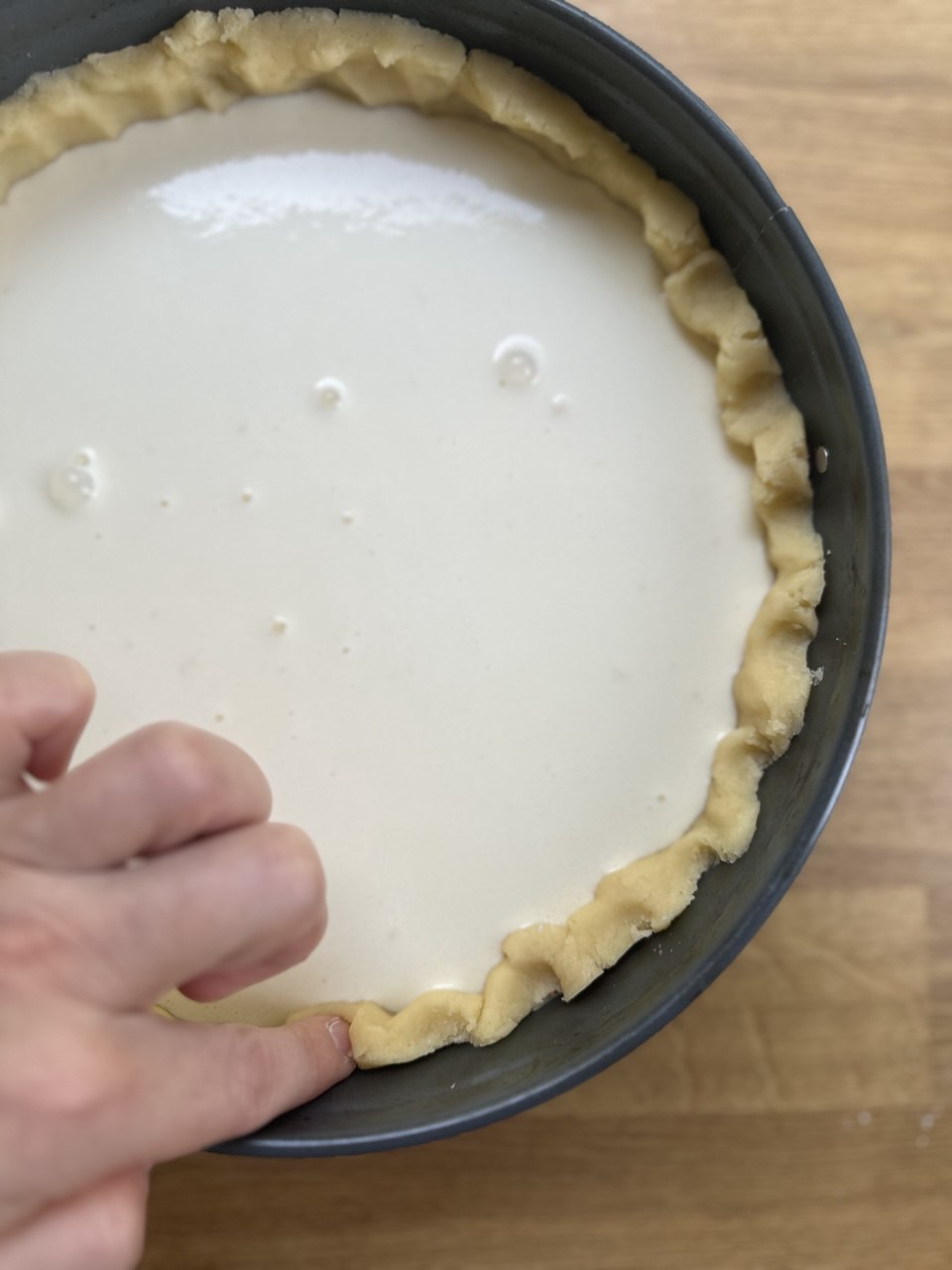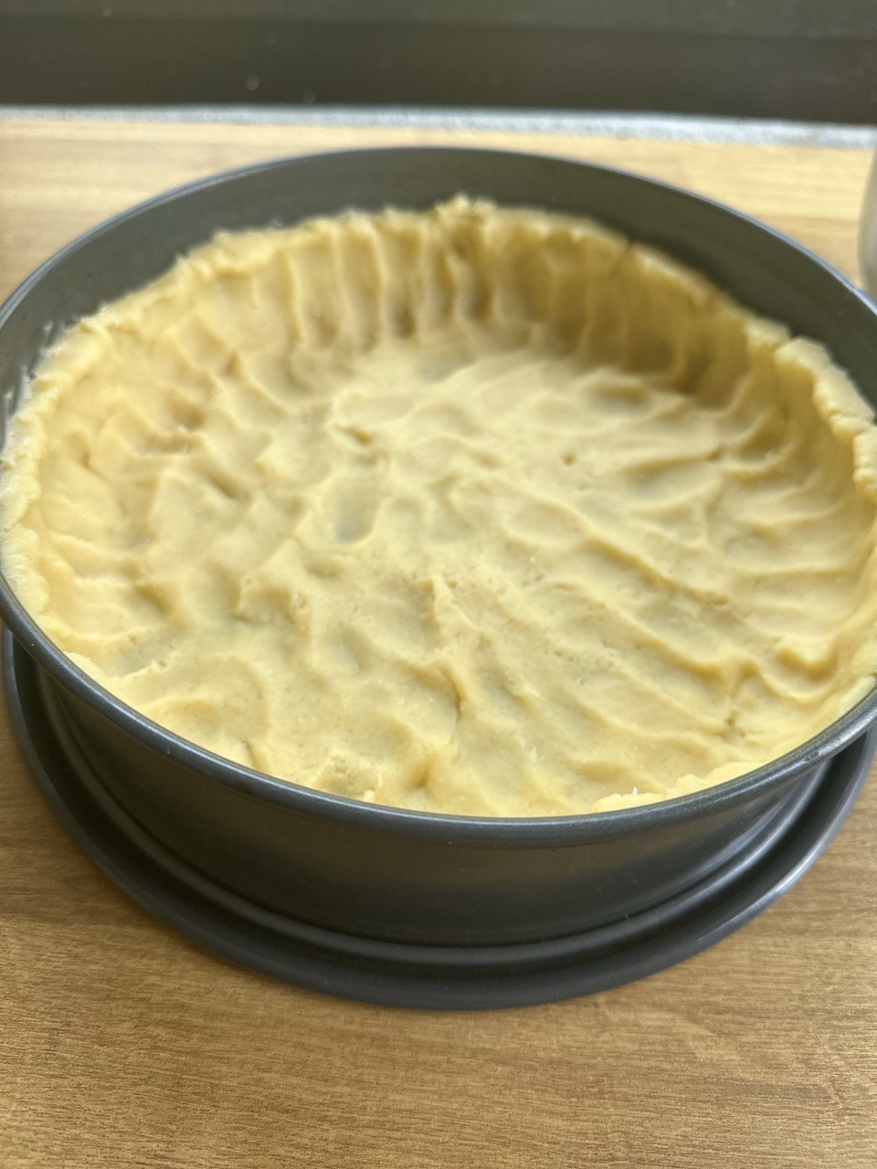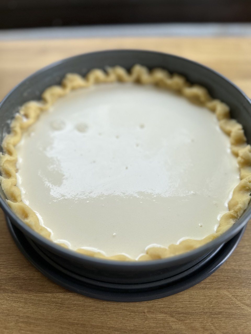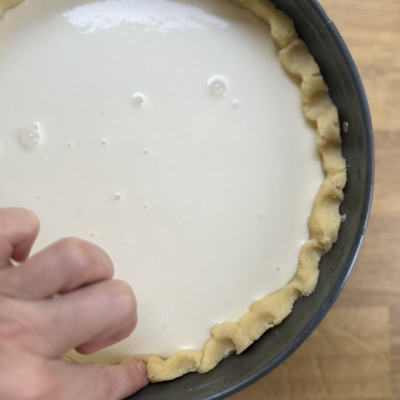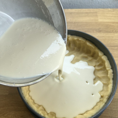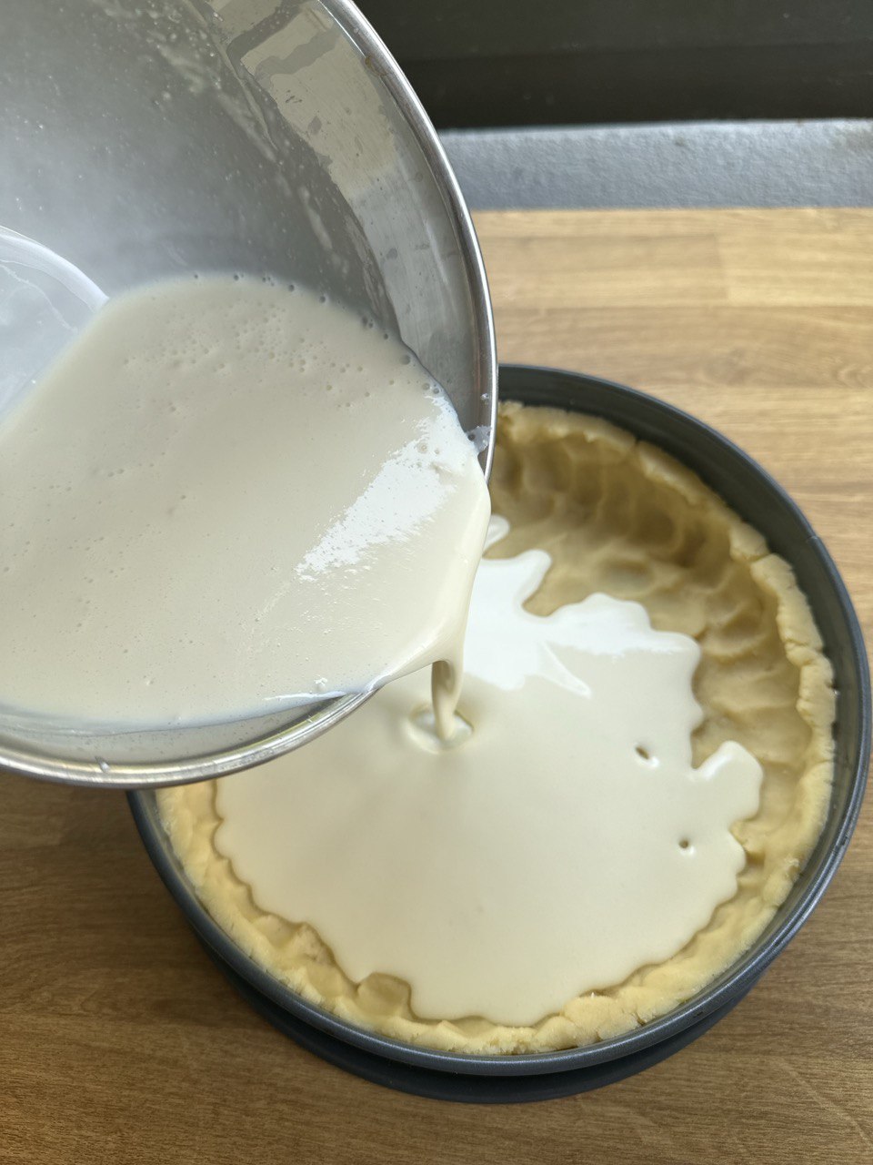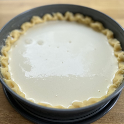 Форму смазываем маслом сливочным. Достаем тесто из холодильника и формируем чашу из теста с высокими бортами. Выливаем жидкую начинку и уравниваем край теста с начинкой