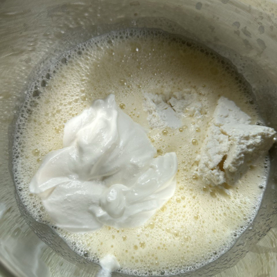 Займемся начинкой. Взбить яйца с сахаром и ванильным сахаром. Добавить творог и сметану. Пробить блендером (можно и миксером, но будут комочки творога), добавить молоко и муку. Взбить. Начинка жидкая