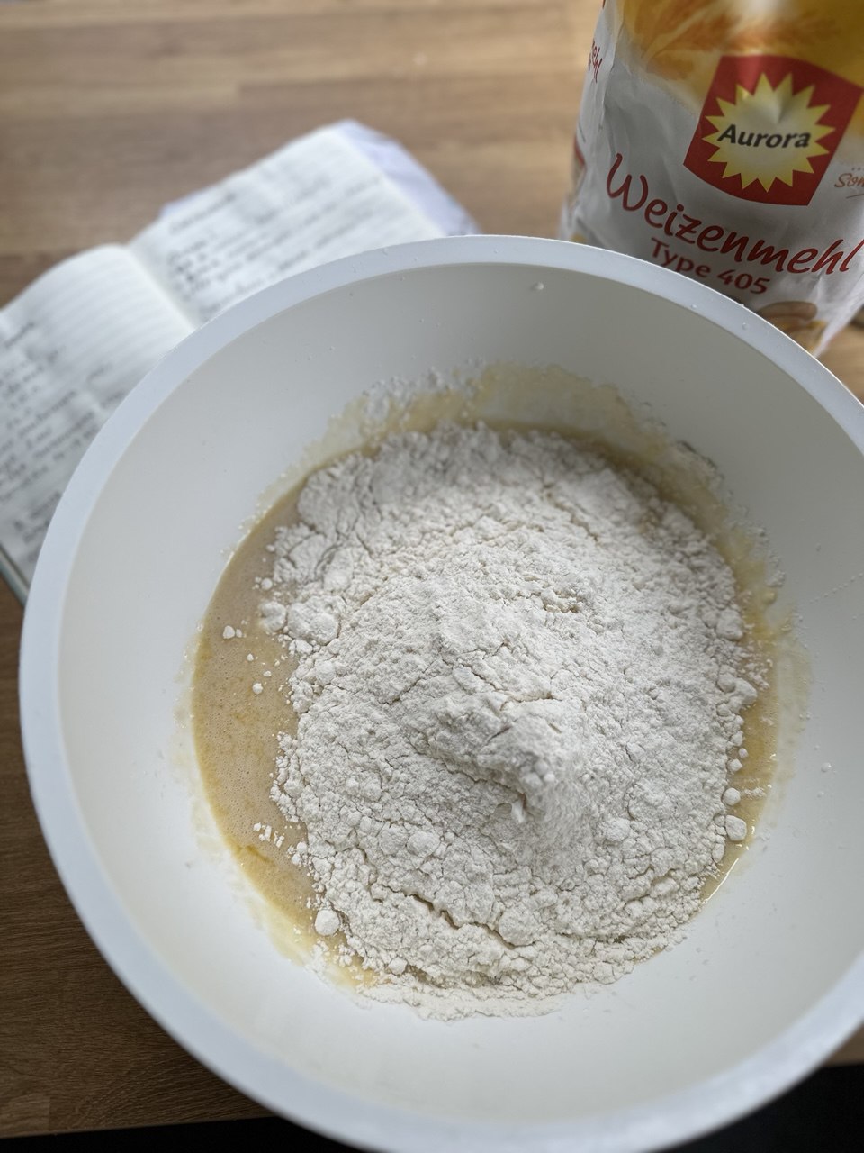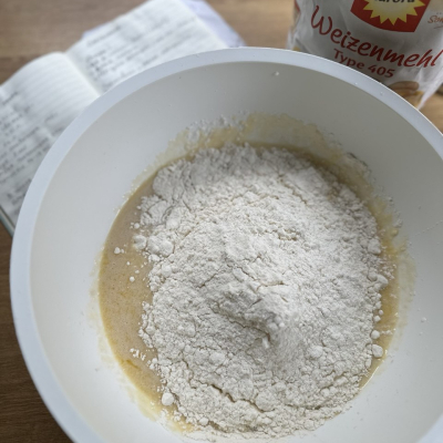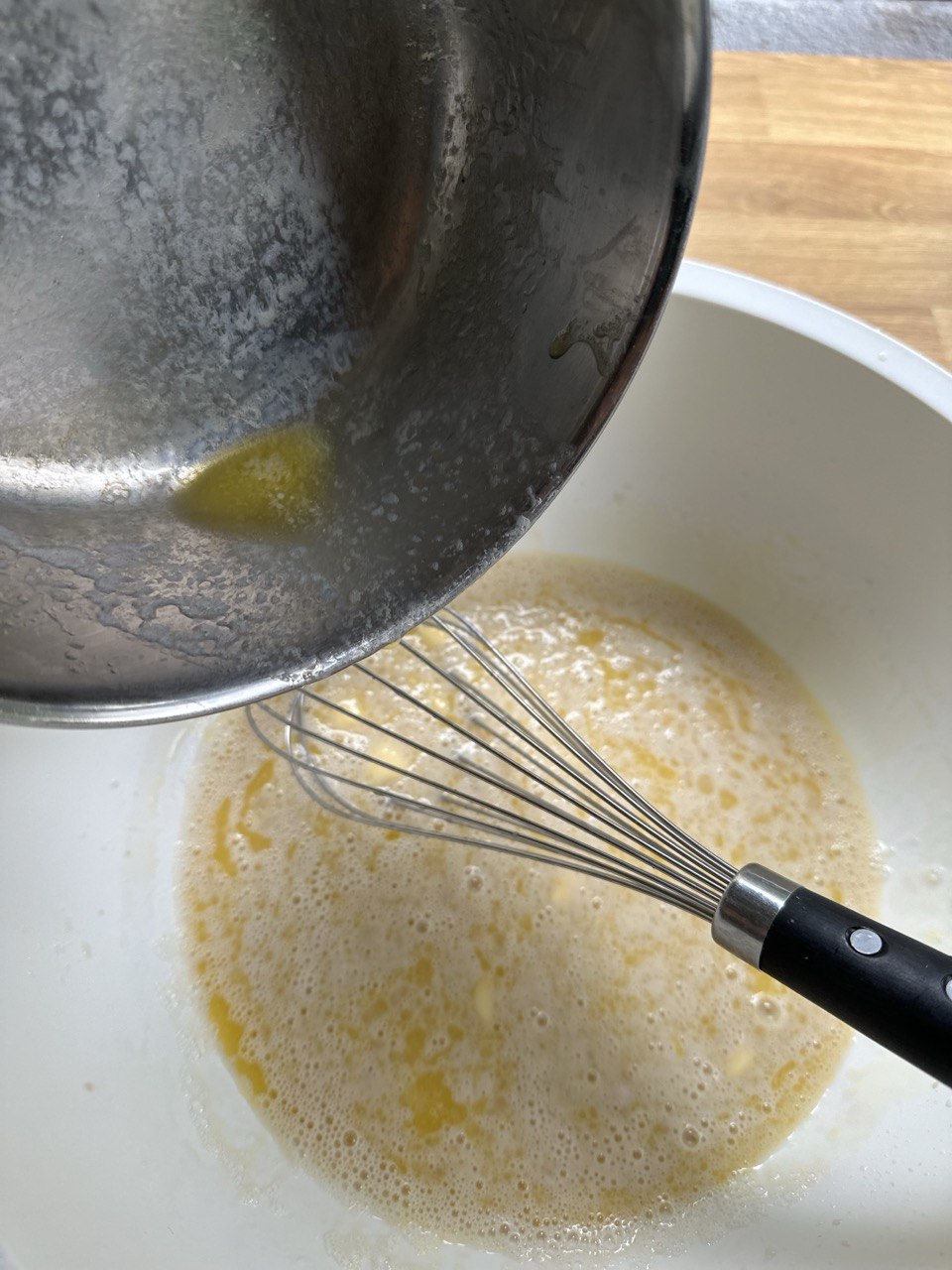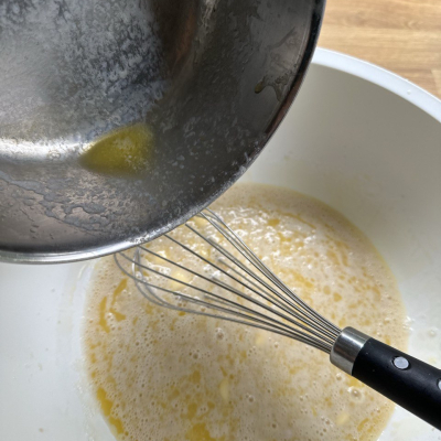 Сливочное масло растопить, остудить и влить в молочно-дрожжевую смесь.