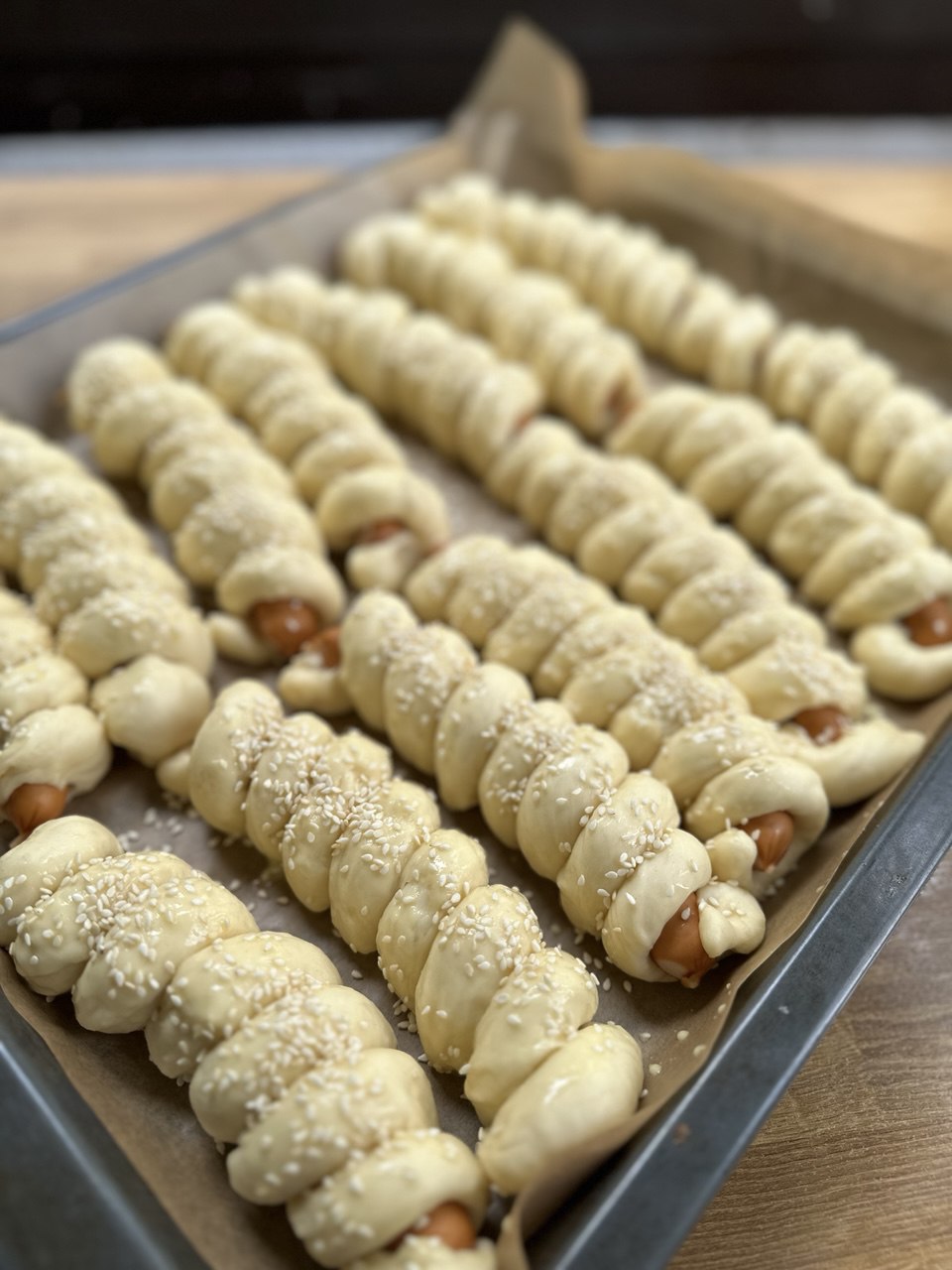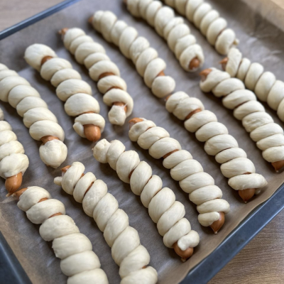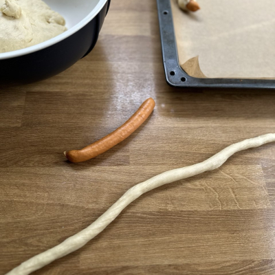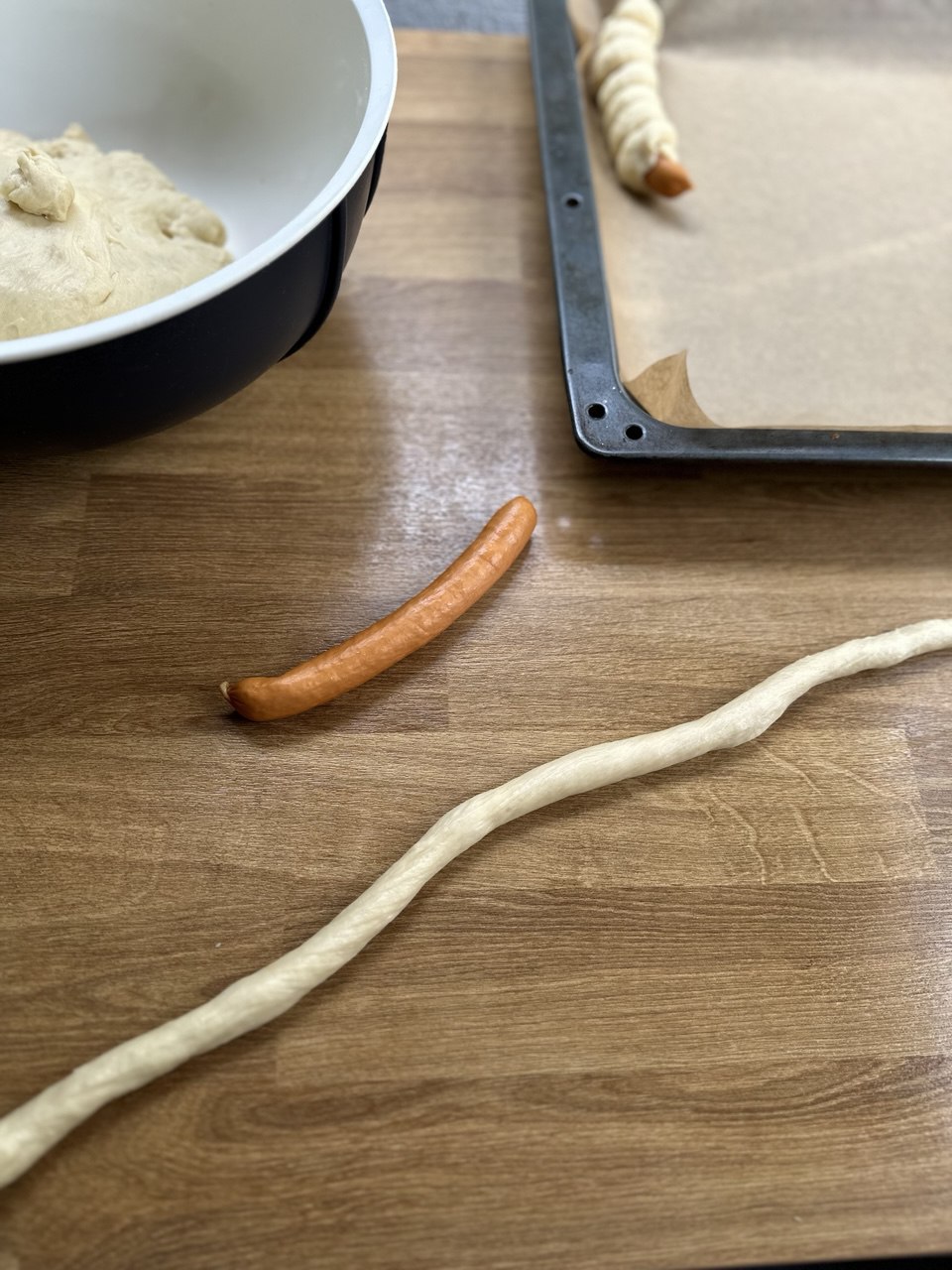 Каждый кусочек раскатать без использования муки в тонкую длинную колбаску. Берем сосиску и обматываем по спирали.