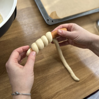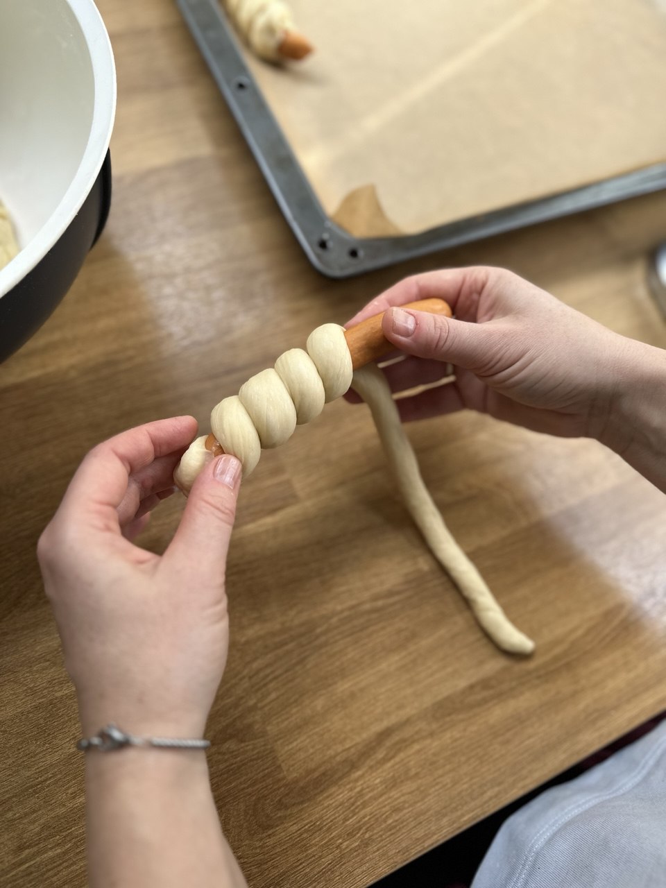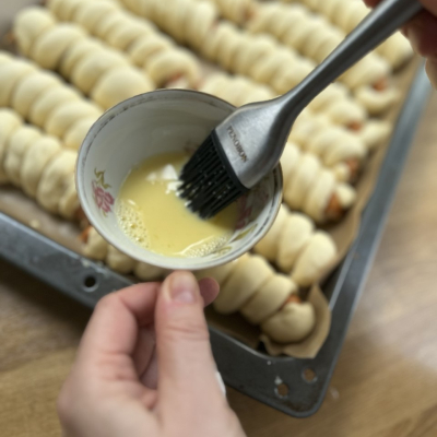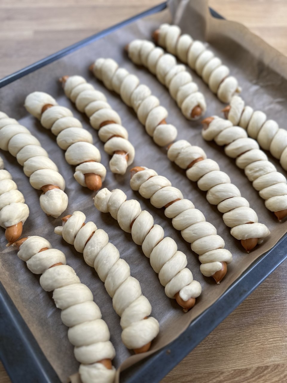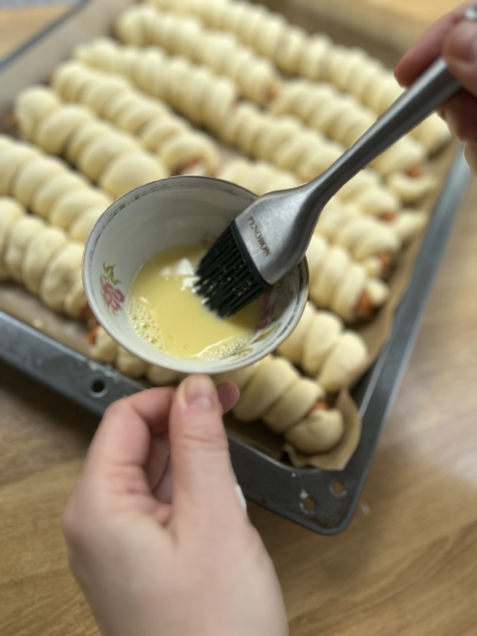 Каждый кусочек раскатать без использования муки в тонкую длинную колбаску. Берем сосиску и обматываем по спирали.