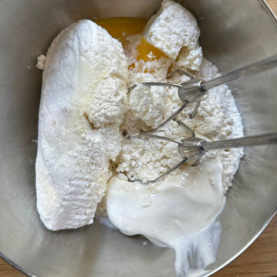 Перемешать все до растворения сахара. Добавить творог и растереть вилкой. Добавить к однородной творожной массе сметану, муку и манку. Получится липкое тесто.